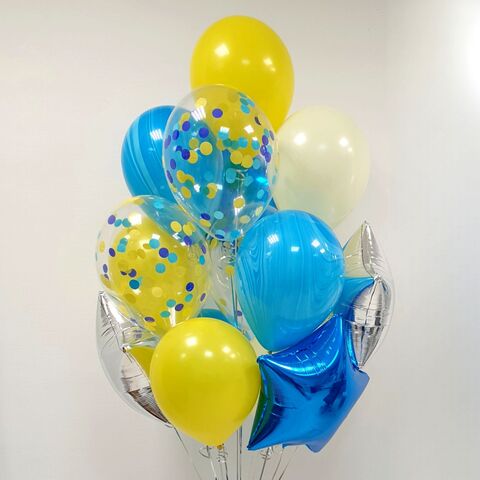 Букет из синих, голубых, белых латексных шаров с принтом и голубым месяцем