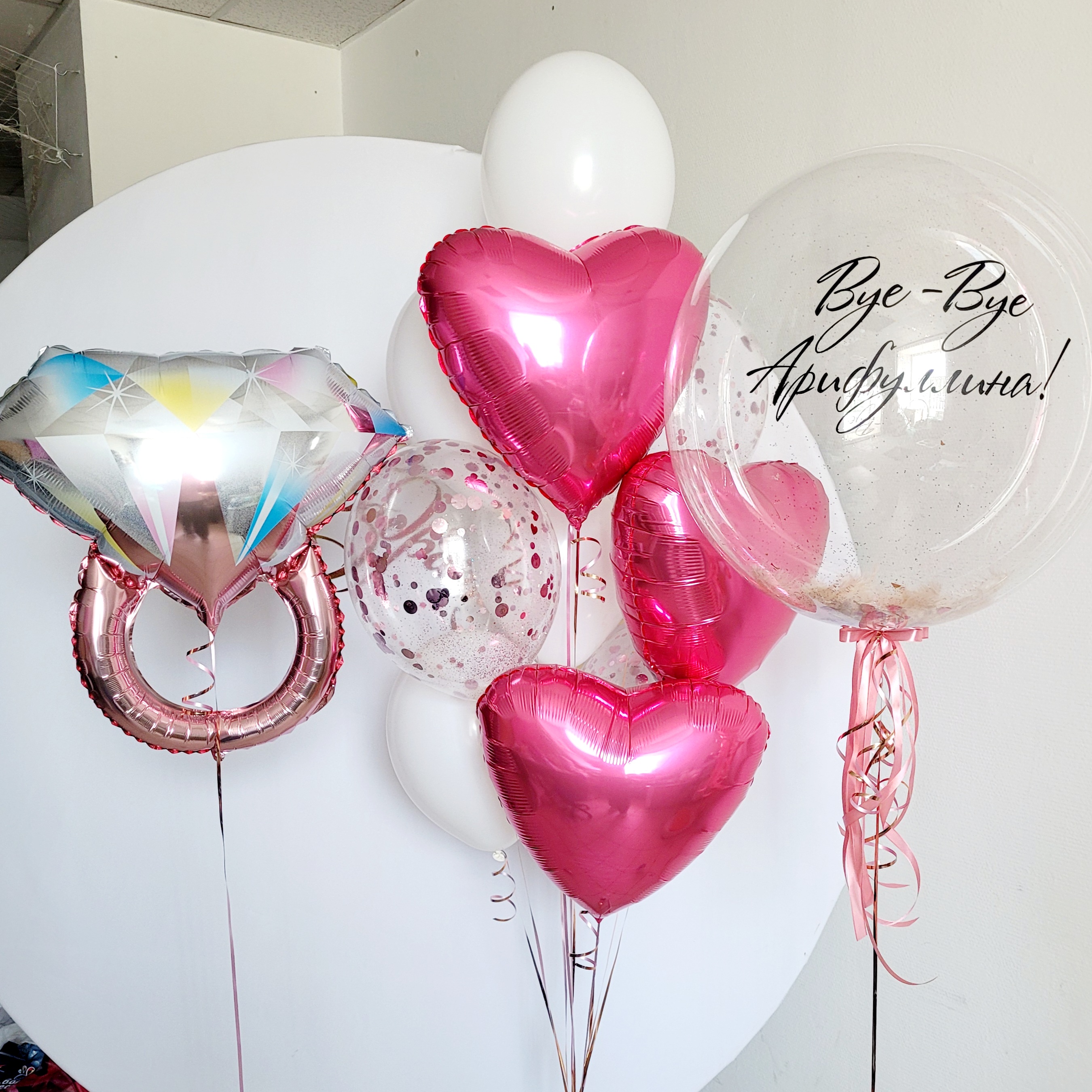 Букет из 10 шаров (3 сердца, 3 шара с конфетти, 4 белых)