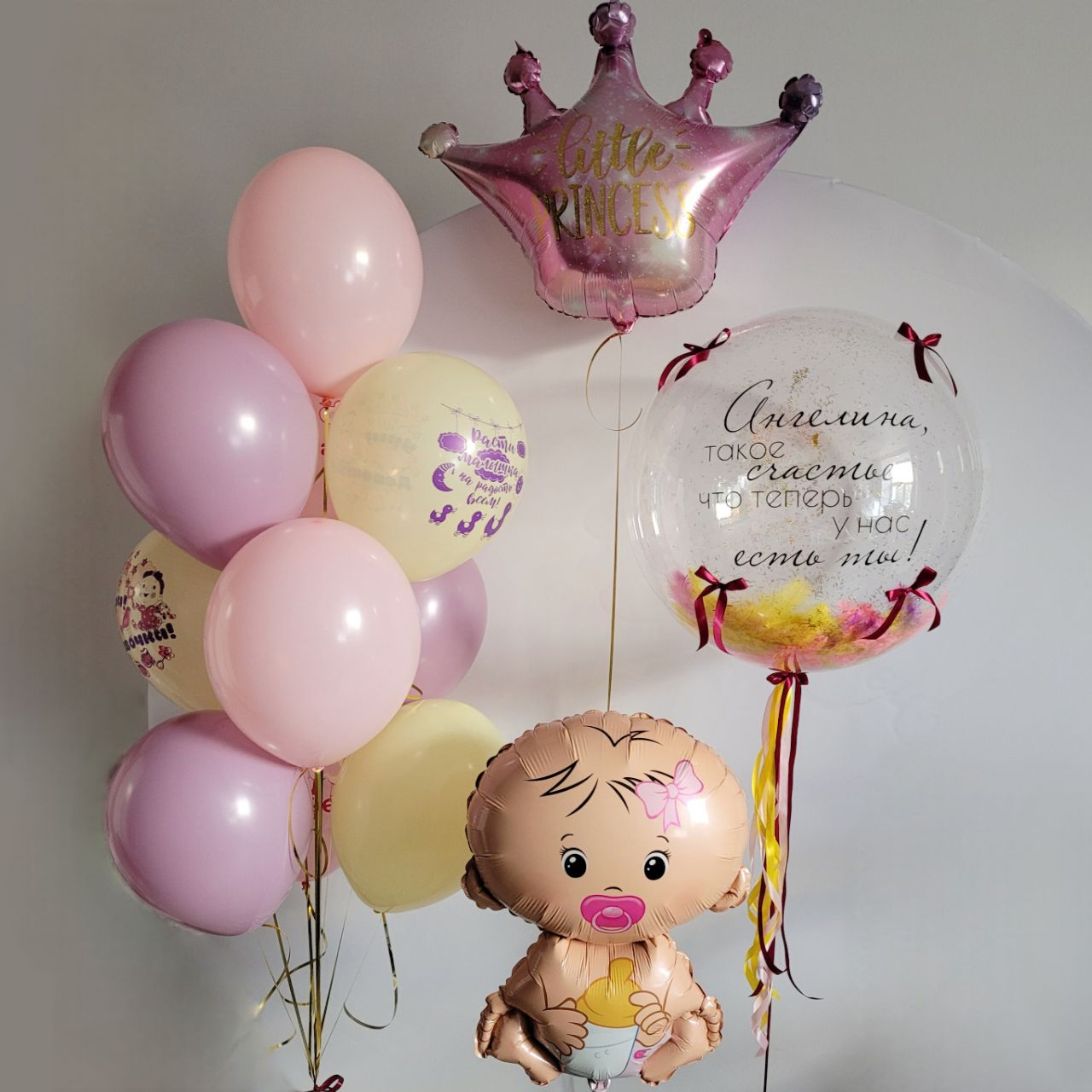 Шар прозрачный Баблс с перьями и бантиками с индивидуальной надписью