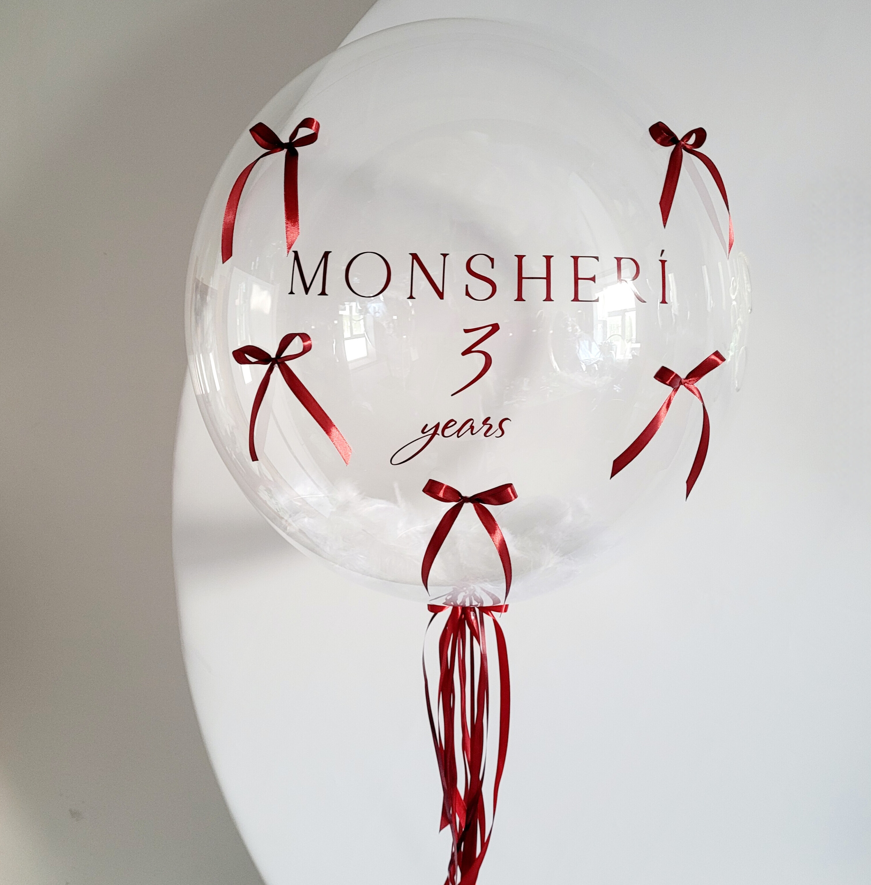 Воздушный шар гигант прозрачный Bubble с белыми перьями и бантиками